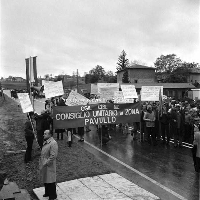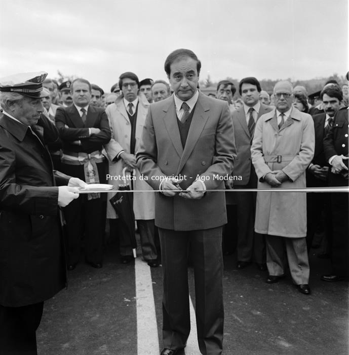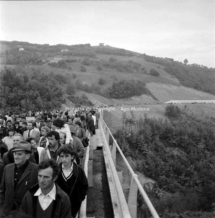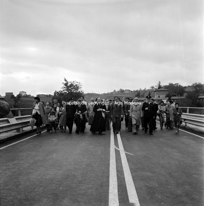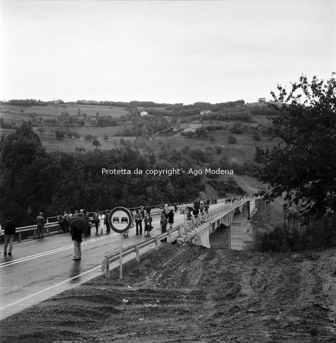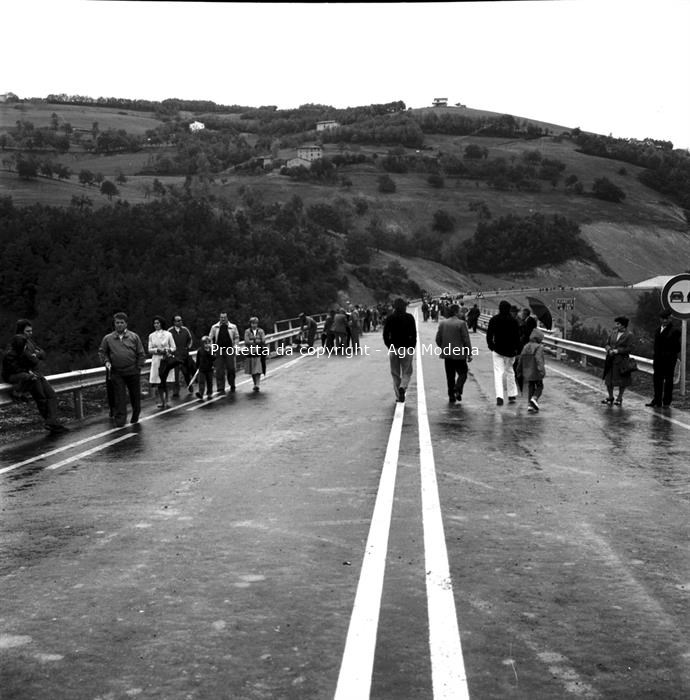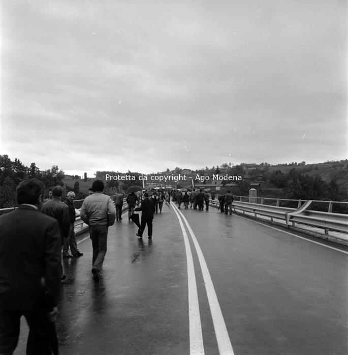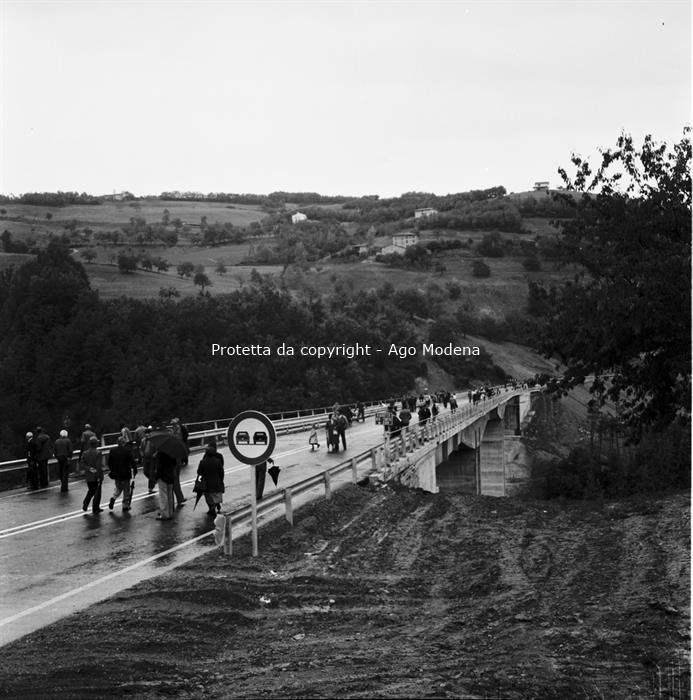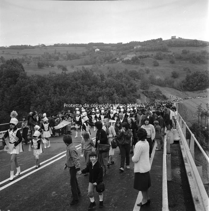 Inaugurazione del viadotto sul Rio Torto, sulla strada provinciale "Nuova estense" (successivamente strada Statale 12), tra Serramazzoni e Pavullo nel Frignano. I rappresentanti politici, sindaci con la fascia tricolore, rappresentanti delle forze dell'ordine sfilano sul viadotto davanti ad una folla di persone. Si riconoscono il presidente della Provincia di Modena Giuseppe Nuara mentre taglia il nastro tricolore, il vescovo di Modena Bruno Foresti che dà la benedizione, Carlo Giovanardi e l'assessore Turci (fotogrammi da 50_845_48 a 50_845_54). Manifestanti con striscione dei sindacati CGIL, CISL, UIL di Pavullo e cartelli con slogan sul lavoro.