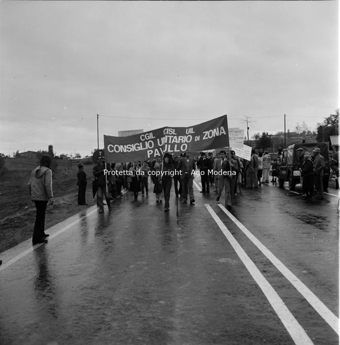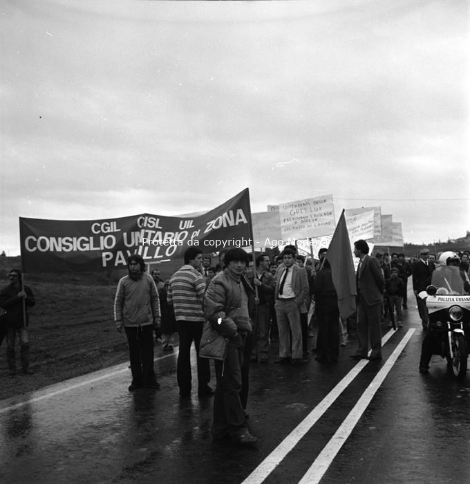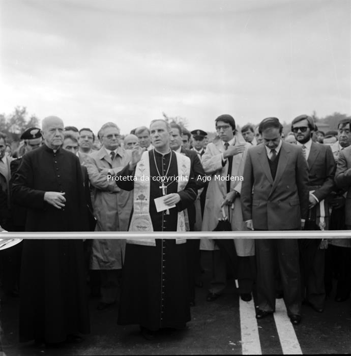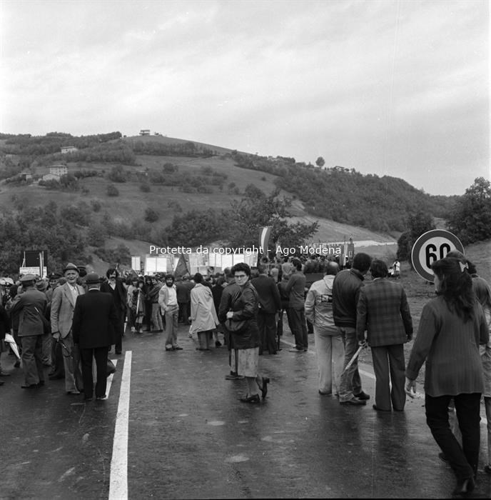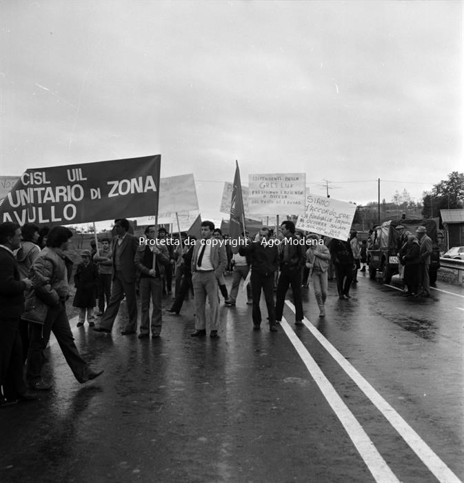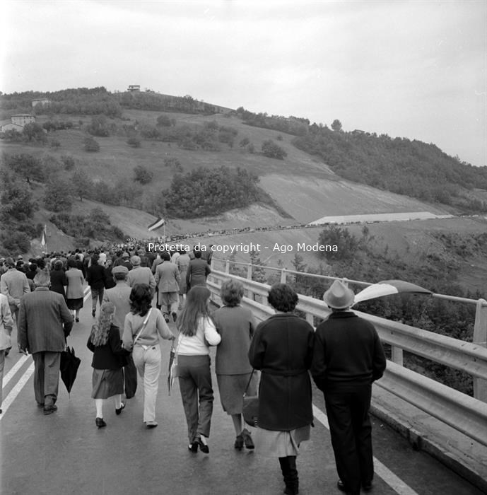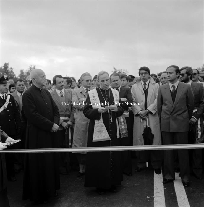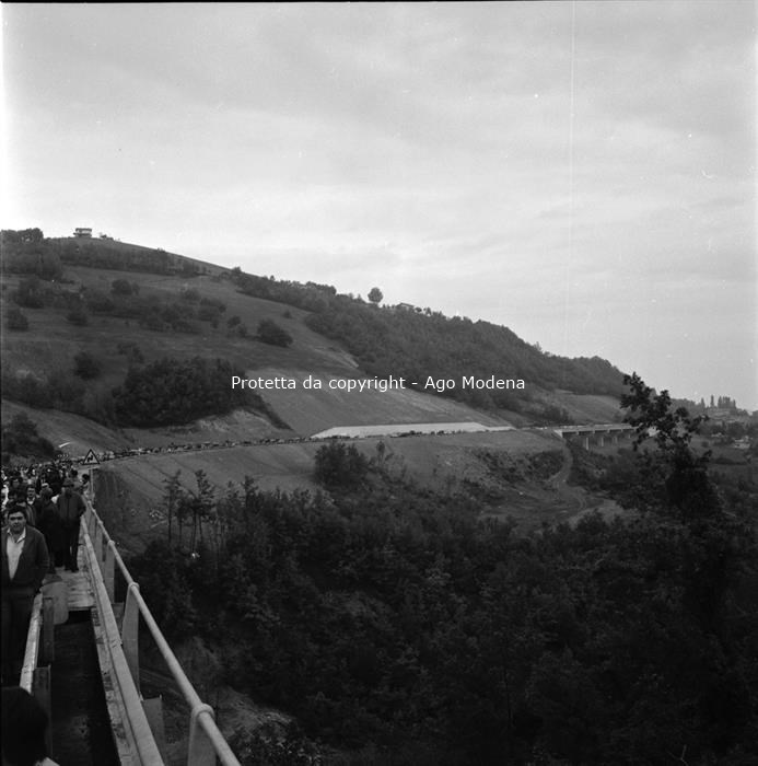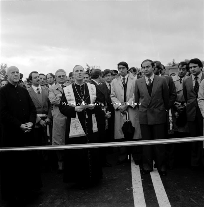 Inaugurazione del viadotto sul Rio Torto, sulla strada provinciale "Nuova estense" (successivamente strada Statale 12), tra Serramazzoni e Pavullo nel Frignano. I rappresentanti politici, sindaci con la fascia tricolore, rappresentanti delle forze dell'ordine sfilano sul viadotto davanti ad una folla di persone. Si riconoscono il presidente della Provincia di Modena Giuseppe Nuara mentre taglia il nastro tricolore, il vescovo di Modena Bruno Foresti che dà la benedizione, Carlo Giovanardi e l'assessore Turci (fotogrammi da 50_845_48 a 50_845_54). Manifestanti con striscione dei sindacati CGIL, CISL, UIL di Pavullo e cartelli con slogan sul lavoro.