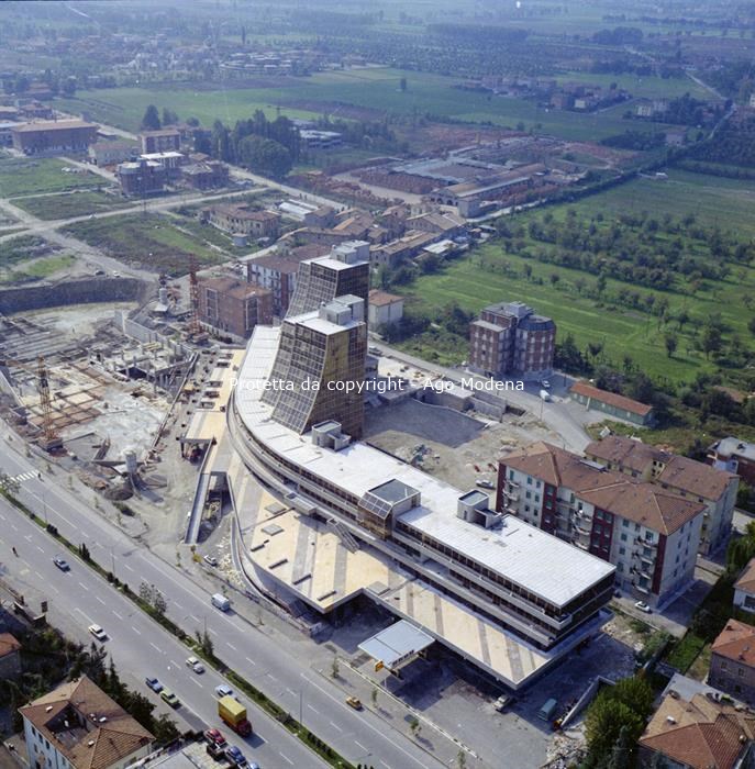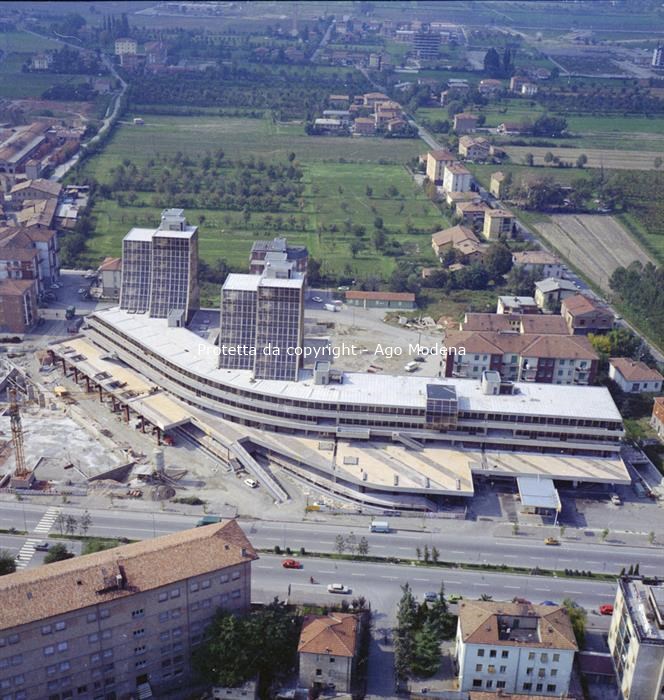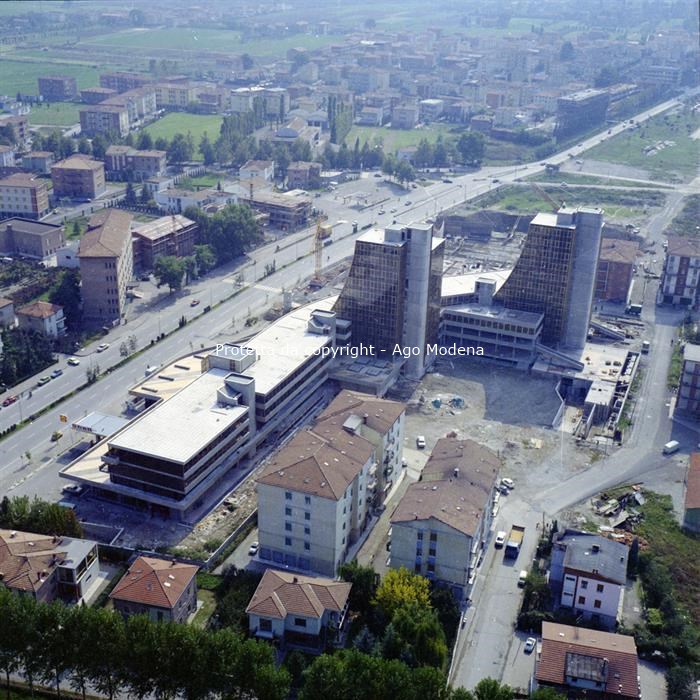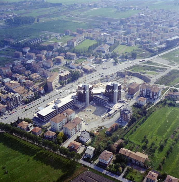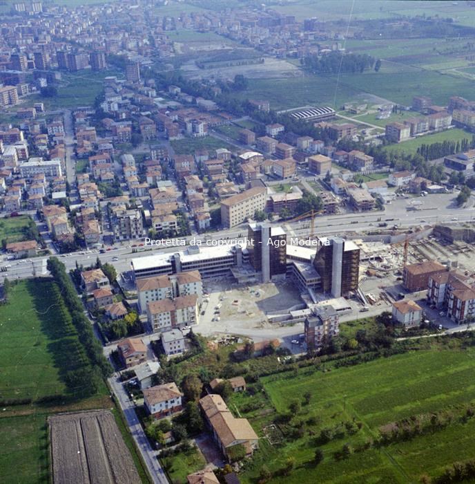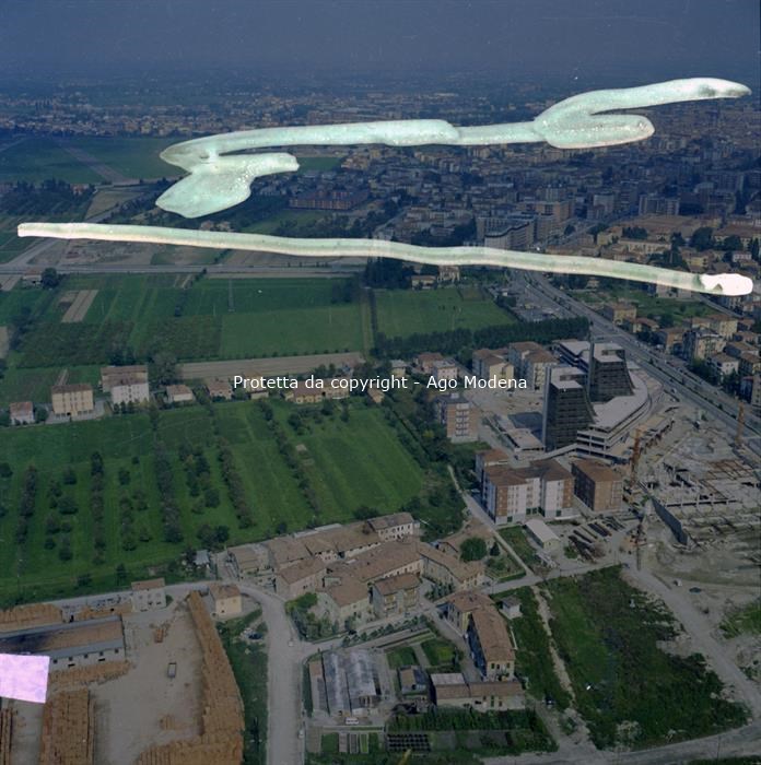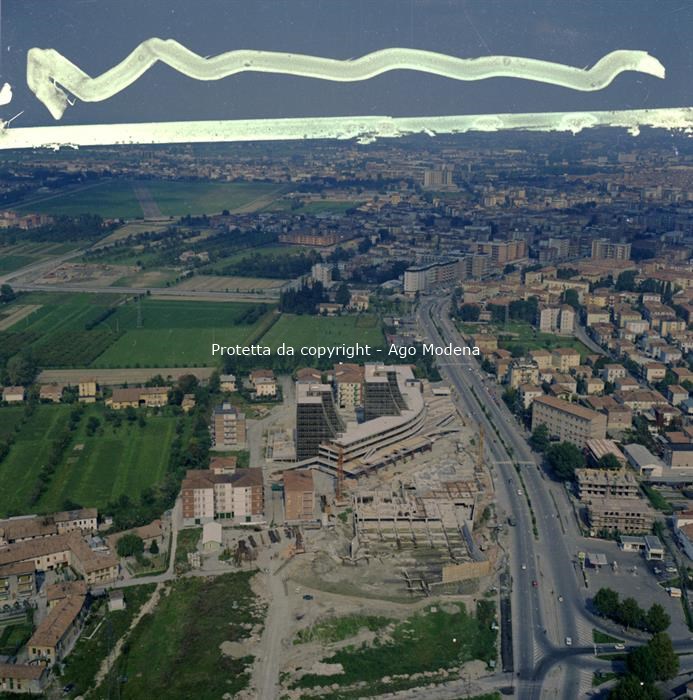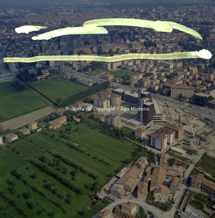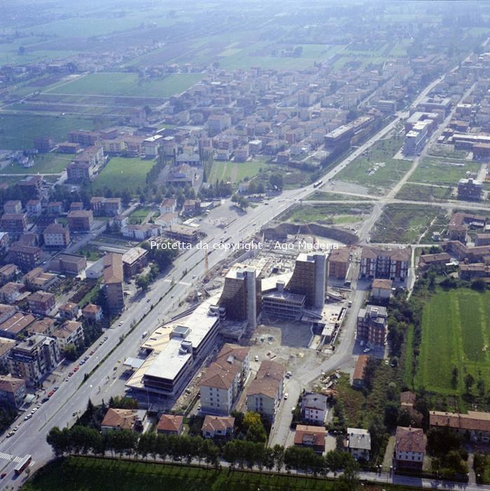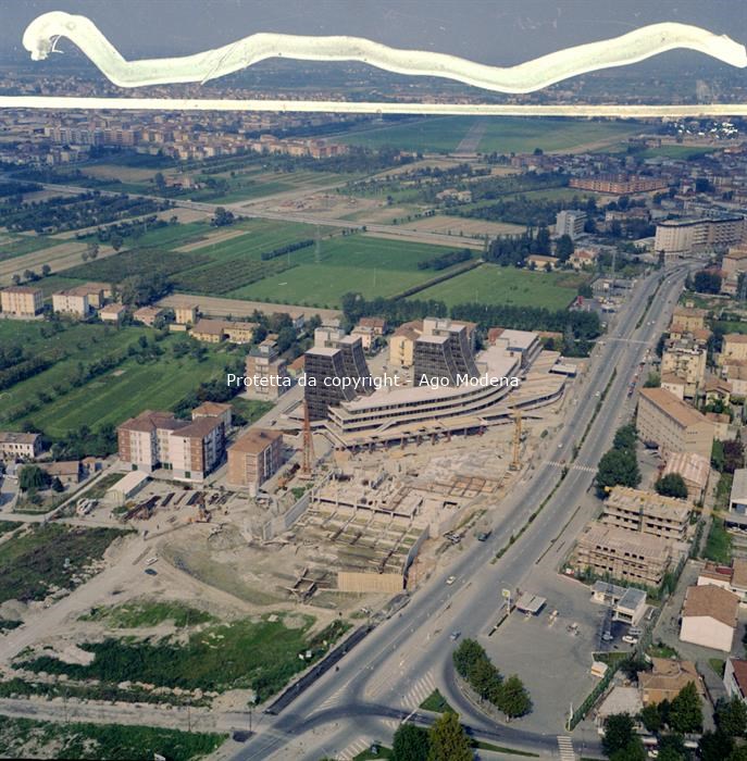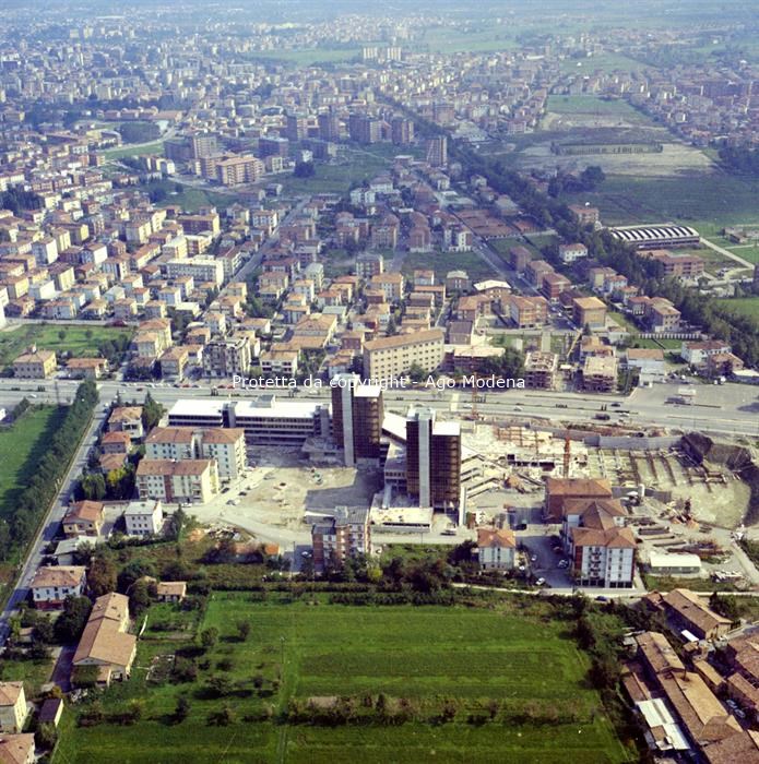 Vedute aeree della zona di espansione urbana lungo la direttrice di via Pietro Giardini: si riconoscono le quattro torri a vela in acciaio e vetro del primo corpo fabbrica del complesso Direzionale 70 progettato dagli architetti Tiziano Lugli, Roberto Corradi e Franco Lipparini. A fianco dell'edificio il cantiere edile della costruzione degli altri due corpi fabbrica che compongono l'intero centro direzionale. Nelle aree circostanti aree verdi non ancora urbanizzate e abitazioni.